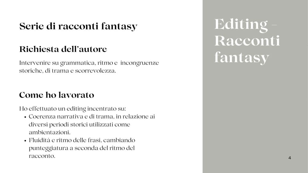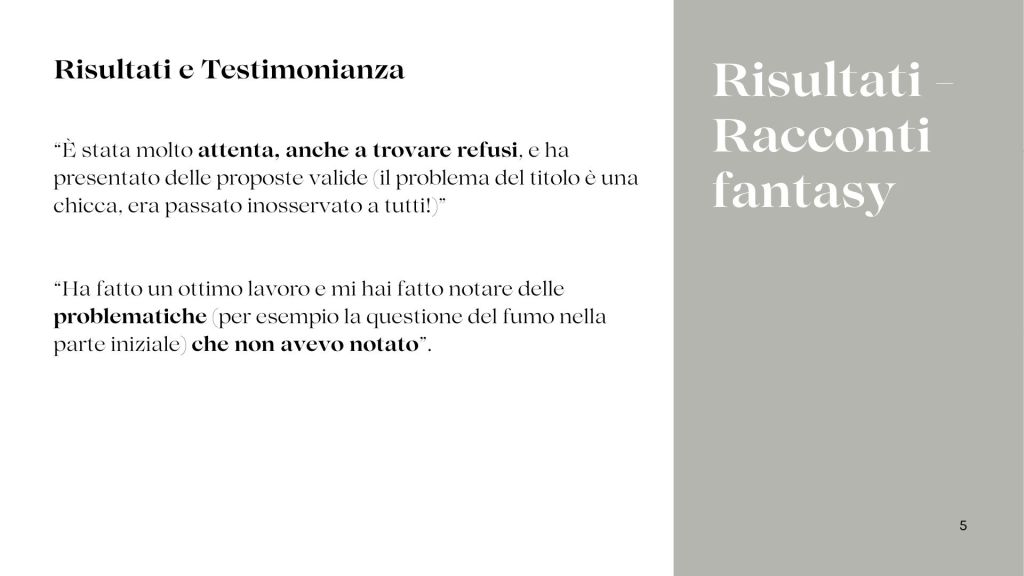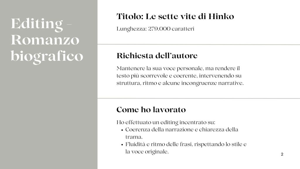 Confermo quanto trovo nel suo sito: “far brillare la tua voce senza alterare il tuo stile” è la chiave del suo modo di intervenire sul testo, e si accompagna a un approccio umano e alla mano che secondo me aiuta da subito a creare collaborazione.